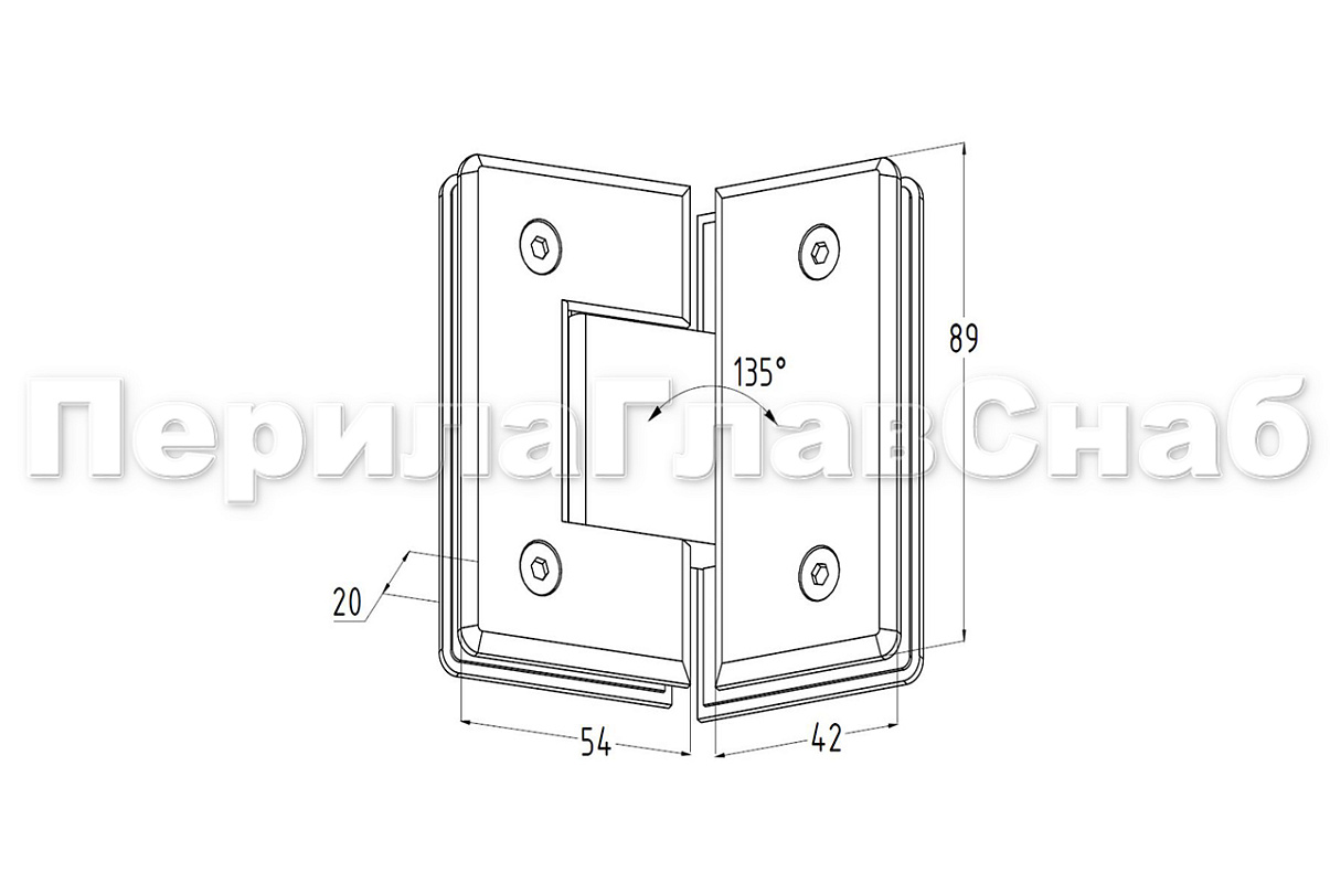Петля для душевой кабины стекло-стекло 135° 90х55 мм. Материал детали - цинк, поверхность - полированная