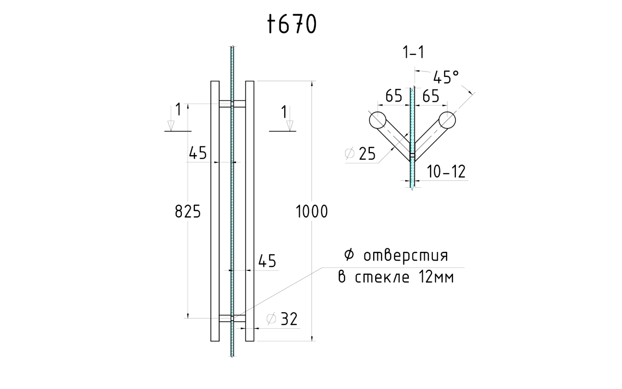 Ручка двухсторонняя 32х825х1000 для стекла 10-12мм, угловая под 45°, матовая t670 SSS