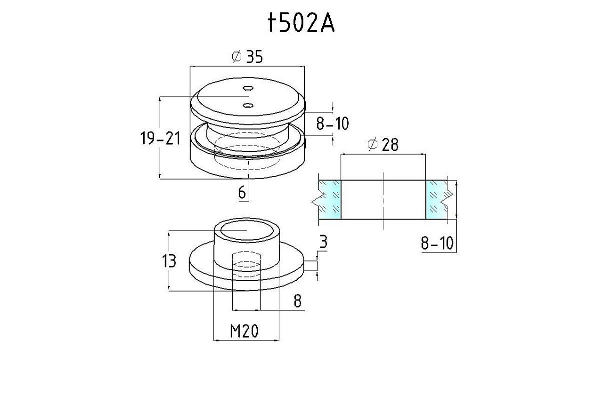 Точечный стеклодержатель 6 мм, нерегулируемый, без зенковки, для стекла 8-10 мм t501A SSS