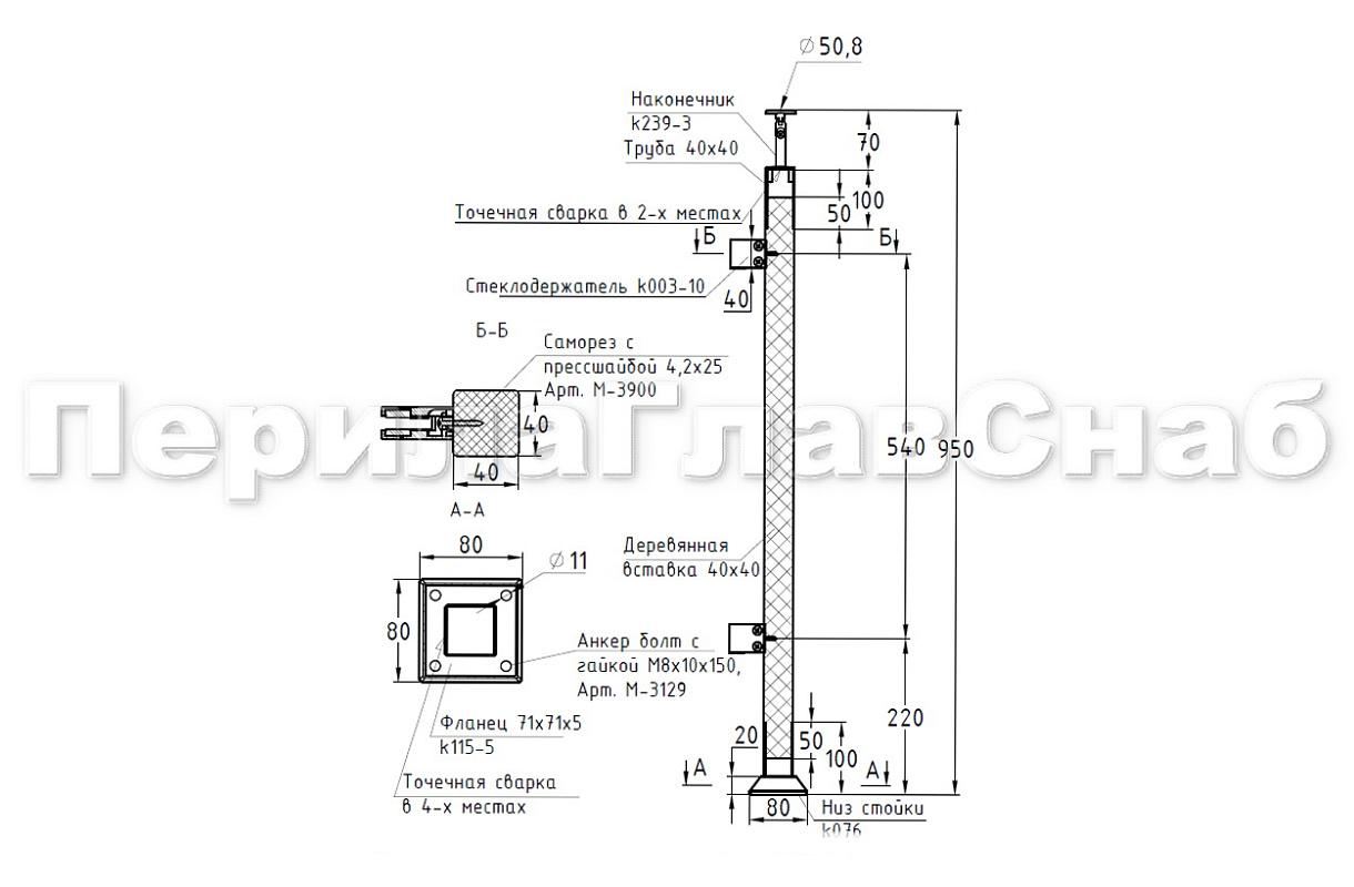 Готовая стойка 40х40х950 мм, деревянная, со вставками из нержавеющей стали 2х100 мм с 3 ригеледержателями k740-1-G купить в Нижнем Новгороде