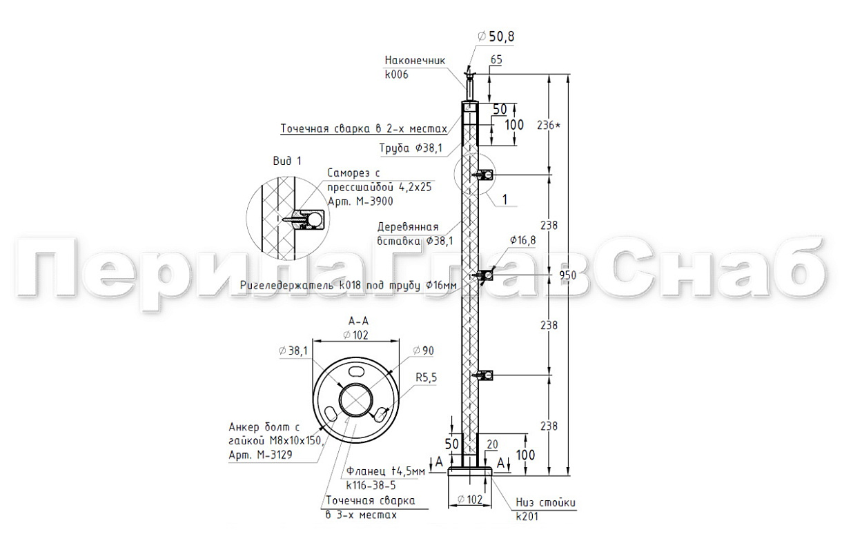Готовая стойка Ø38,1 мм, с фланцем и наконечником, высота 950 мм, полированная (AISI 304) k702 купить в Нижнем Новгороде