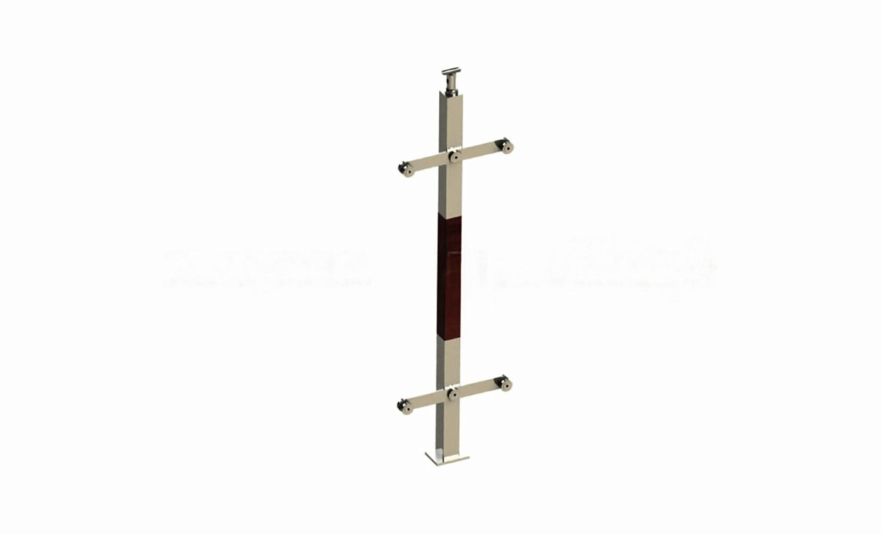 Стойка эксклюзивная квадратная с деревянной вставкой и двумя спайдерными стеклодержателями, крепление в пол, регулируемый ложемент (AISI 304) k789