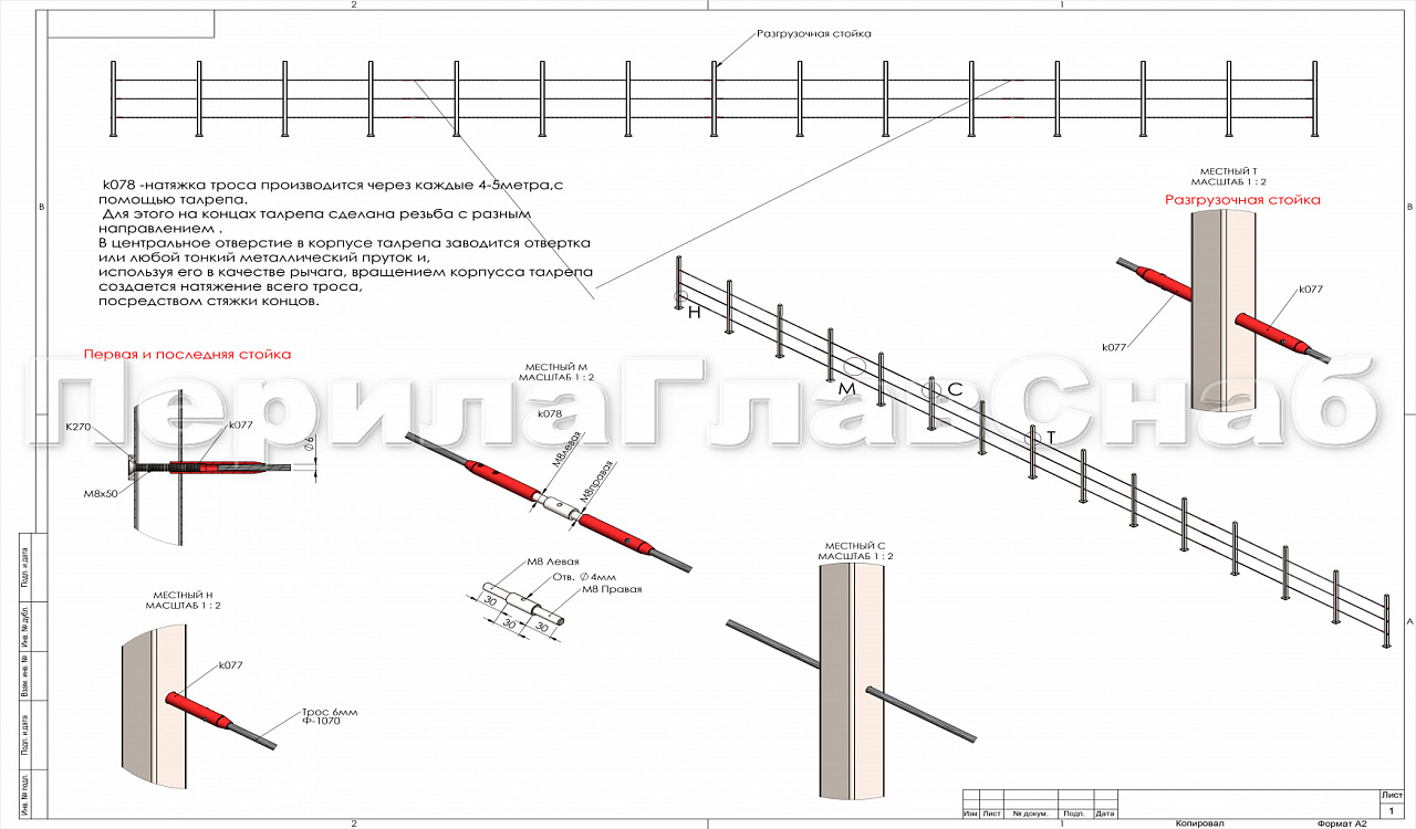 Служит для натяжения тросов в ограждениях. На концах талрепа при помощи зажимных винтов фиксируются трос. Для этого в центральной части талрепа сделана резьба с разным направлением вращения.