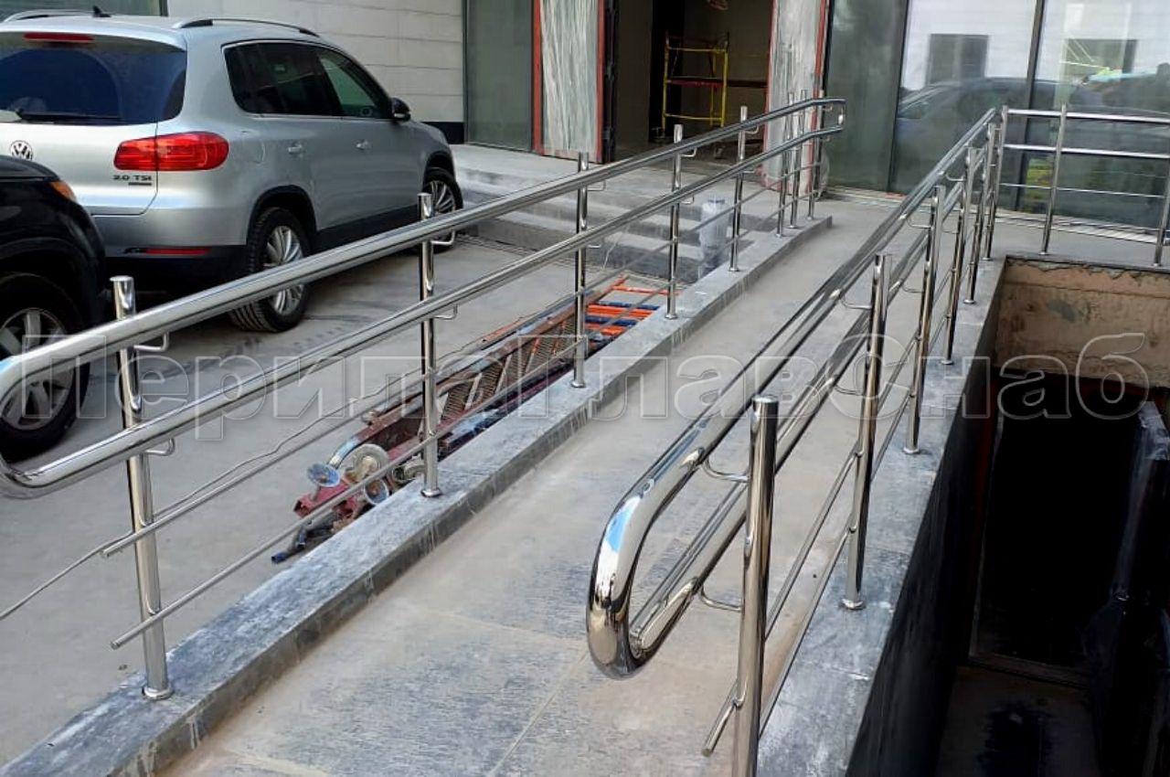 На данном объекте нами были выполнены ограждения внутренних лестниц, ограждения пандуса, а также изготовление и монтаж цельностеклянных тамбуров. Общая длинна ограждений составила сто пятьдесят метров погонных. Ограждения внутренних лестниц были выполнены из полированной нержавеющей стали, стойки и поручень сечением 40*40 мм, ригель сечением 20*20 мм. Для того чтобы сохранить ширину марша и площадки, крепления ограждений производилось в торец лестничных маршей, сквозь стойку на шпильку и колпочковую гайку. Все сварные швы были зачищены и заполированы. Тамбур цельностеклянный был выполнен из закалённого стекла марки м-1 толщиной 10 мм, фиксация стекла производилась на алюминиевом зажимном профиле Т-40 с накладками из шлифованной нержавеющей стали. На этапе осмотра и замера объекта где предполагалось установить цельностеклянные тамбуры, нами были даны заказчику рекомендации по установке закладной трубы под навесным потолком, для того чтобы надежно закрепить зажимной профиль и придать жёсткости конструкции. Двери цельностеклянные так же были выполнены из закаленного стекла толщиной 10мм, с доводчиком. Доводчик устанавливался в бетонный пол. Ограждения пандуса были выполнены из полированной нержавеющей стали aisi 304 для наружного применения, стойки устанавливались методом алмазного бурения с последующим вклеиванием на цементно –химический клей, такой метод крепления позволяет надежно закрепить ограждение и исключить его вырыв из основания при эксплуатации ограждений. Для того чтобы обеспечить беспрепятственный доступ в помещение маломобильных групп населения, ограждения пандуса были выполнены с соблюдением ГОСТа Р 51261-99. Работы велись под строгим контролем технического надзора со стороны заказчика и под контролем нашего прораба, сопровождающего работы на данном объекте. Это дало возможность оперативно решать возникающие вопросы и быстро устранять какие-либо замечания со стороны заказчика в процессе монтажа ограждений.