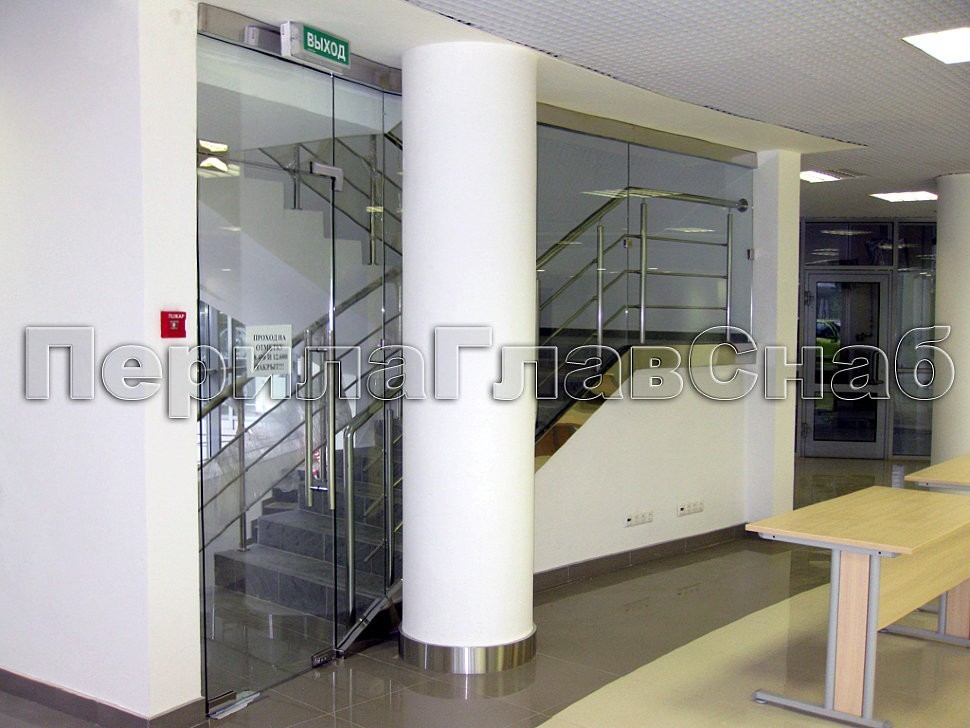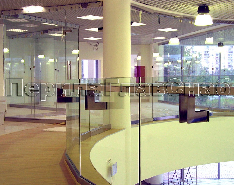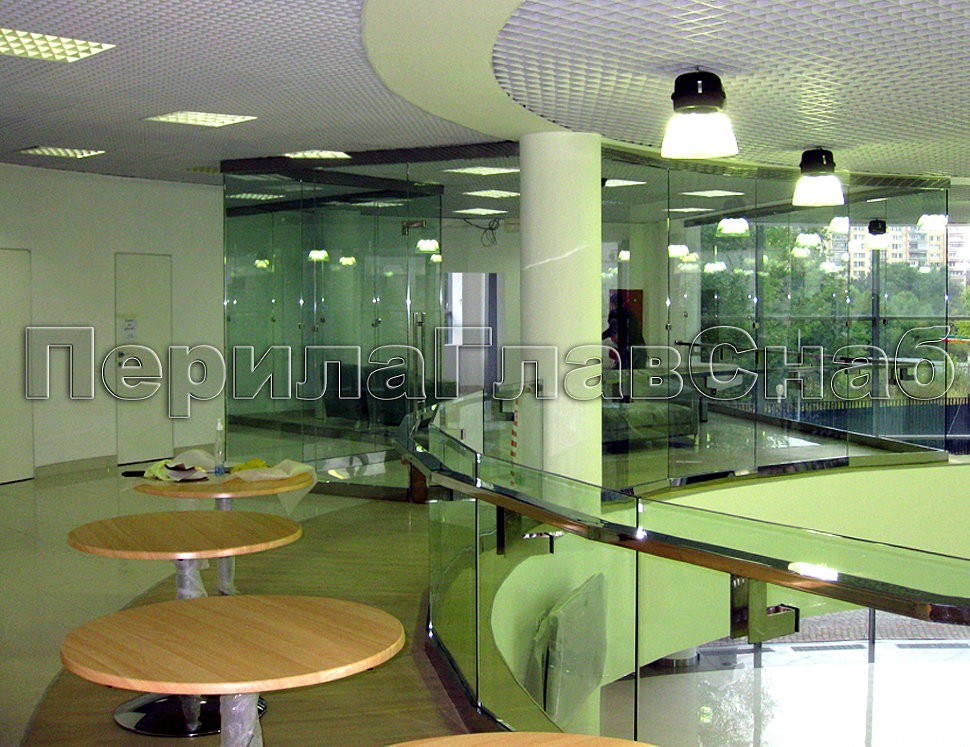 Ограждение со стеклом и цельностеклянные перегородки на заднем плане.Обратите внимание, часть стекол ограждения соединяет пол и потолок по всей высоте, при этом образуется поворот ограждения по радиусу атриума, а уходит в качестве стены на офисную часть помещения.