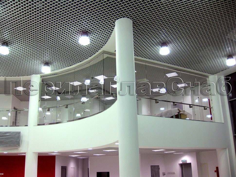 Ограждение со стеклом по кругу атриума.Оригинальный элемент совершенно уникальных для данного типа ограждений — поручень на выносных элементах установлен сбоку стекла.На заднем плане хорошо видны цельностеклянные офисные перегородки.