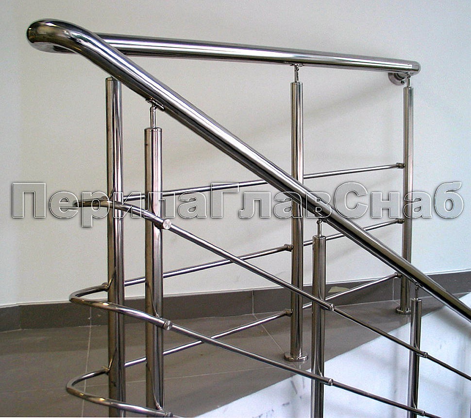 Ограждение из полированной нержавеющей стали с ригелями на бочатах и наконечниками стоек в виде штырей с ложементом под круглый поручень