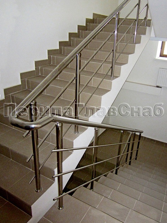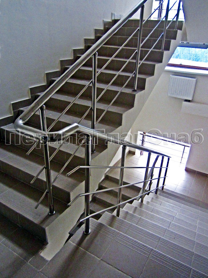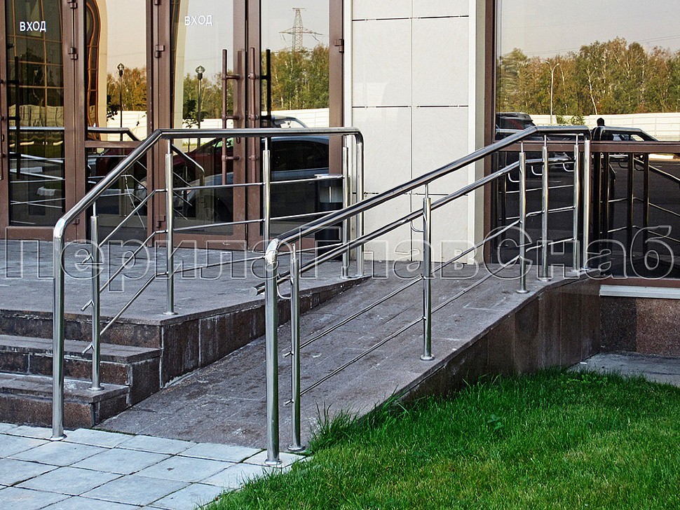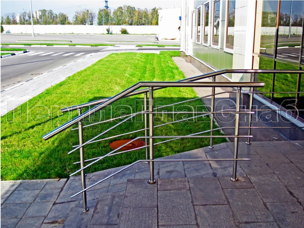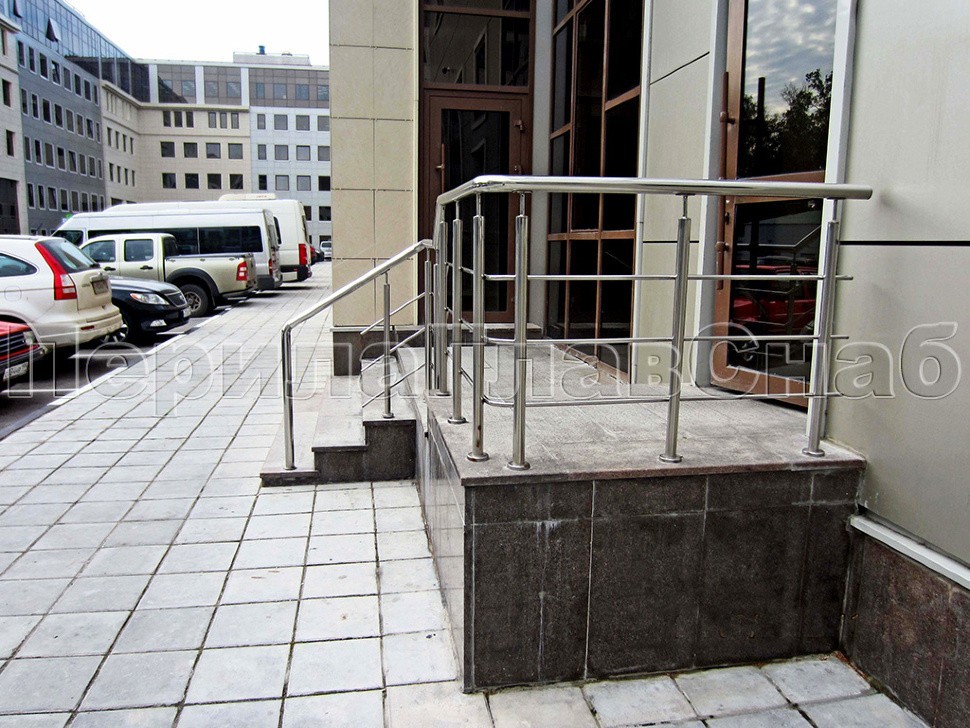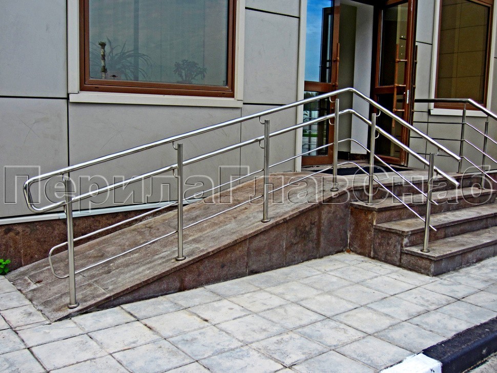 Ограждение лестницы из нержавеющей стали с дополнительным поручнем для инвалидов.Наконечники стоек в виде штырей, поручень для инвалидов крепится на выносных держателях.
