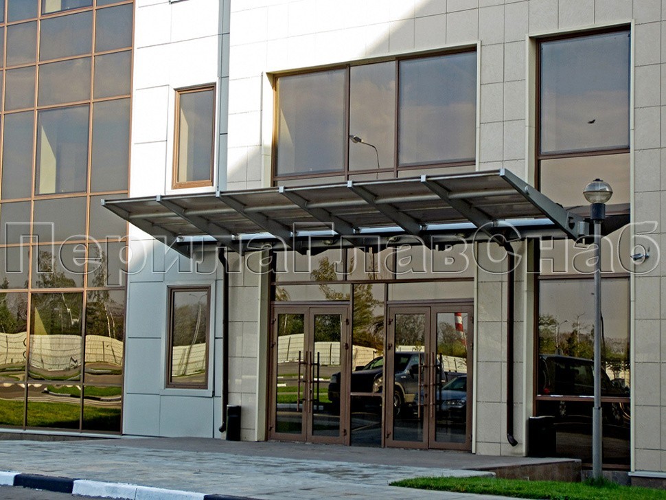 Каскад из трех козырьков с поликарбонатом над въездом в подземный гараж.В качестве опор использованы колонны из окрашенной нержавеющей стали.