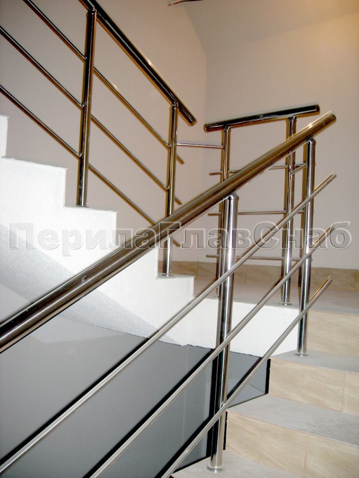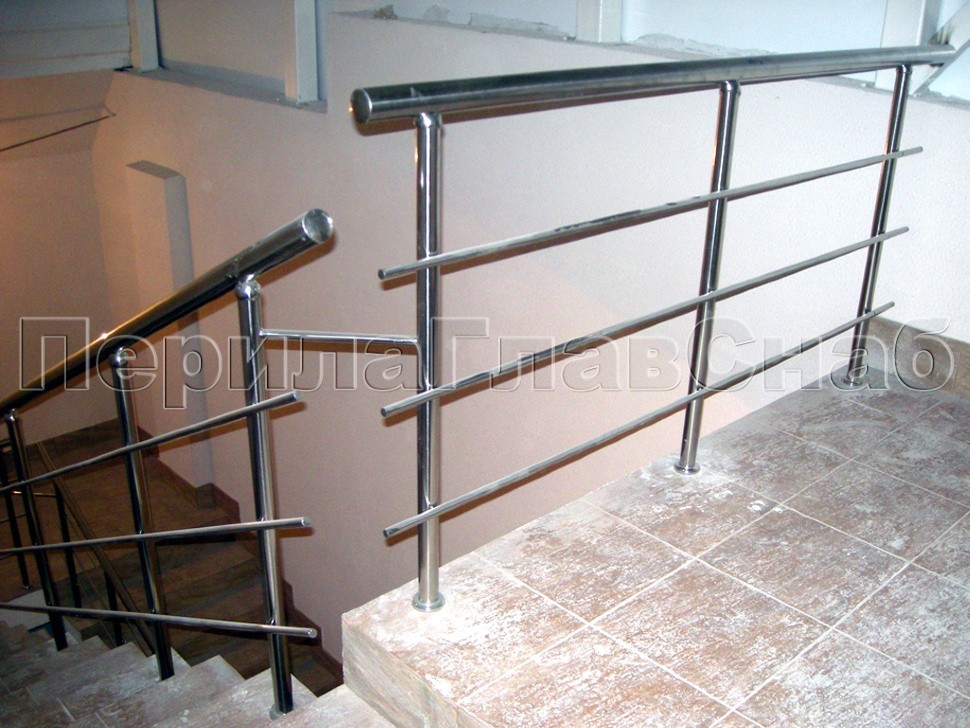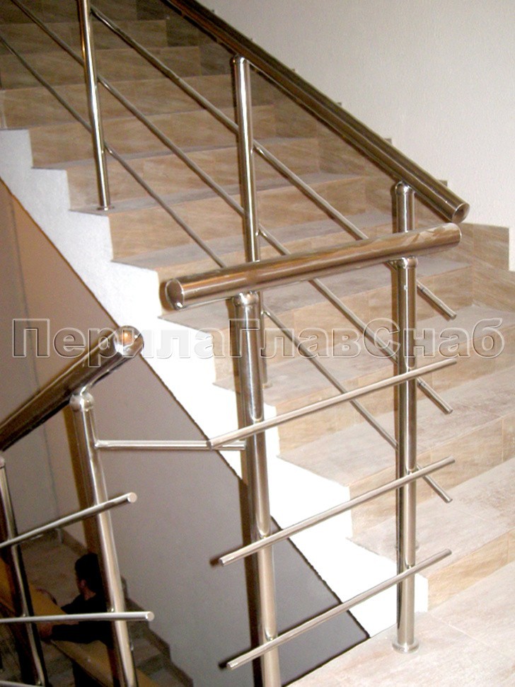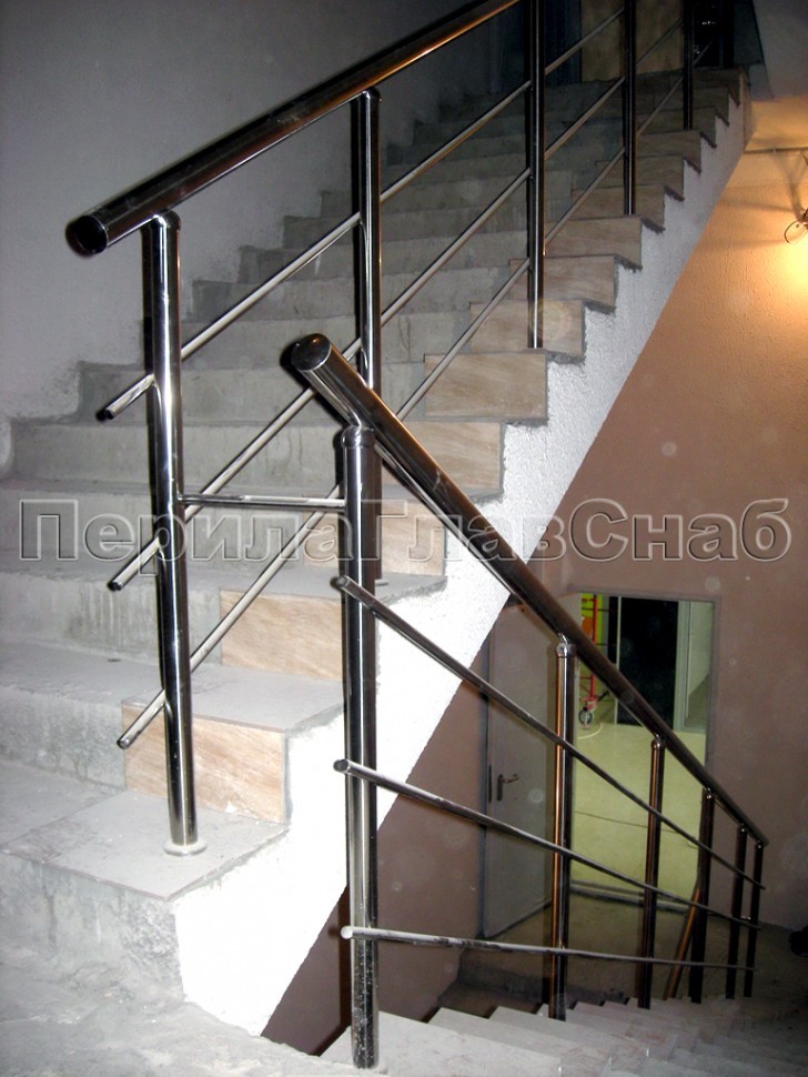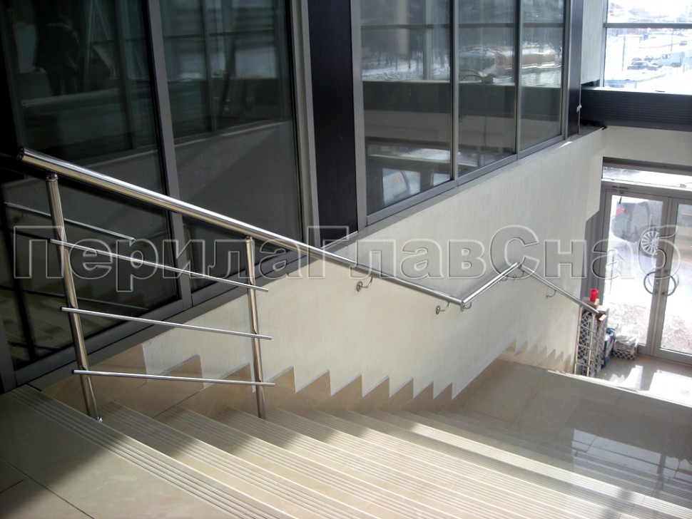 Перила из нержавейки переходят пристенный поручень на марше бельэтажа.Конструкция наиболее интересна в том смысле, что поручень основного ограждения является как бы продолжением пристенка, образуя с ним единое целое.Обратите внимание, насколько изящно вписаны ригели на вершине и основании марша у самого входа в здание.Хотите выделить свой объект из массы однотипных построек?Звоните: +7 (495) 646-10-70