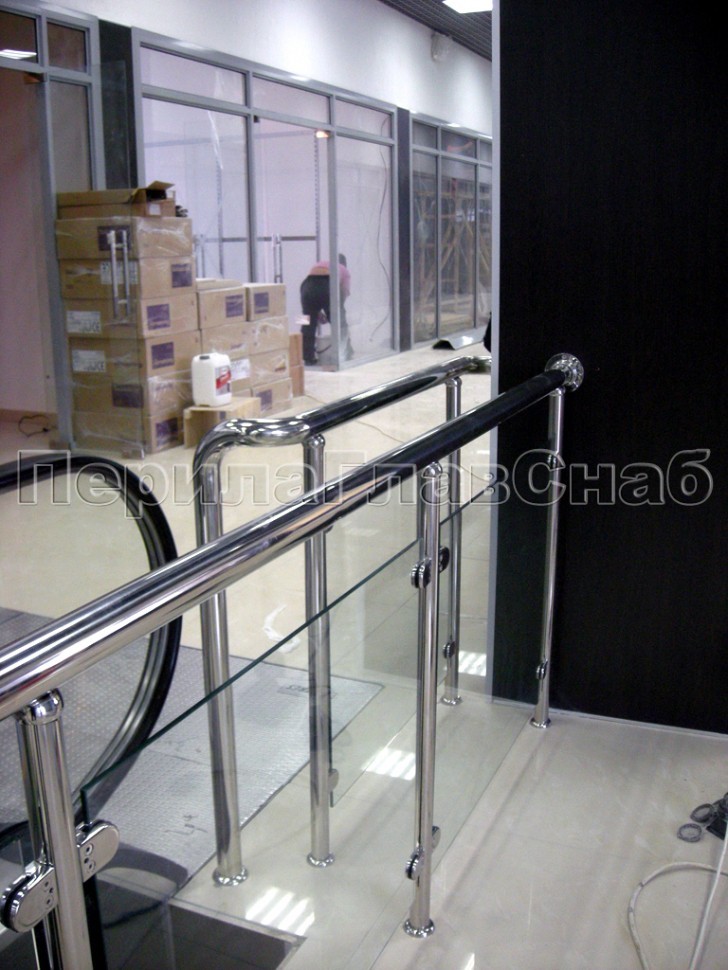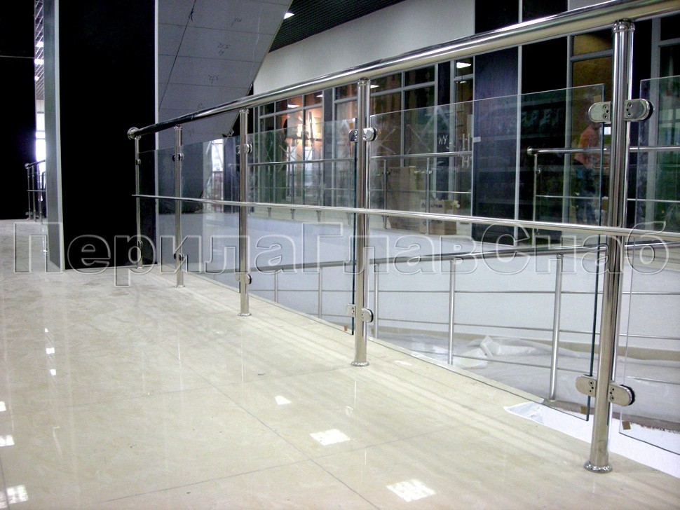 Ограждение со стеклом и ригелем, защищающим стекло атриума второго этажа с завязкой поворота наклонного поручня и выходом на инвалидный пандус