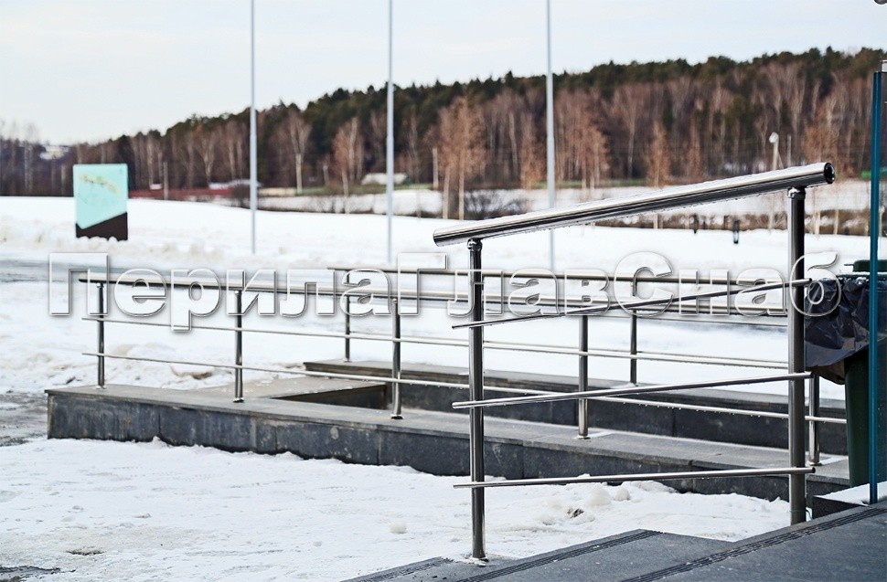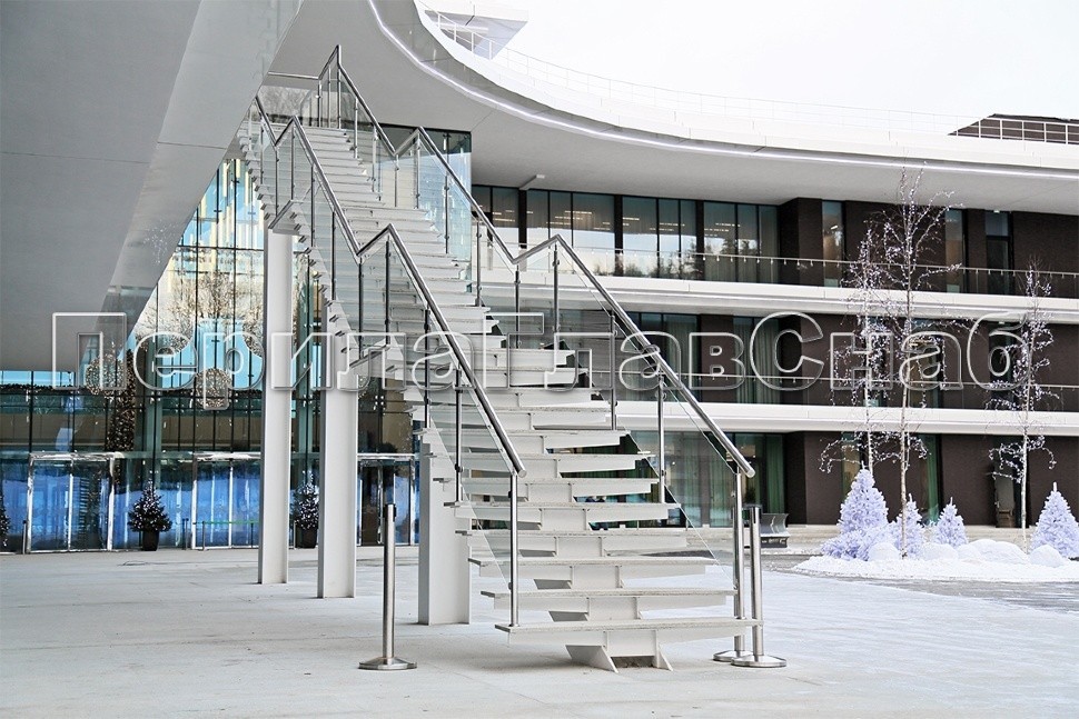 Ограждение лестницы выполнено на стойках с креплением в ступень, в качестве заполнения стекло на зажимных стеклодержателях.