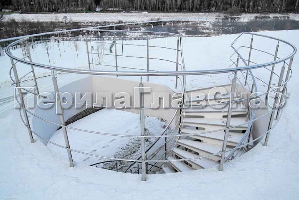 Ограждение винтовой лестницы из нержавеющей стали. Ограждение второго этажа на несущем стекле с поручнем на выносных стеклодержателях.