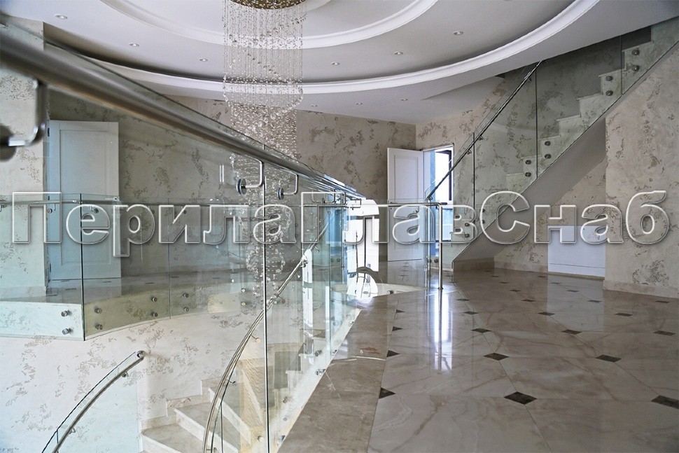 Ограждение забежной лестницы в частном доме выполнено на несущем стекле, поручень на выносных держателях завязан в пол.