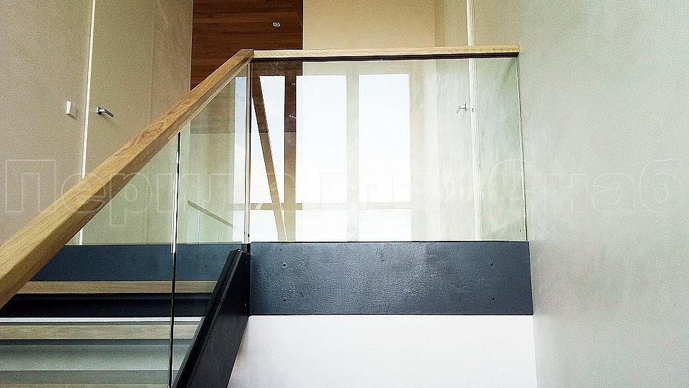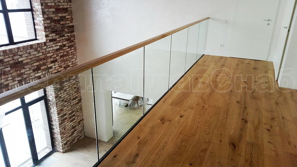 Установили цельностеклянное ограждение на балкон. Стекло установлено в алюминиевый профиль с пазом. Сверху на стекло закреплен поручень из нержавеющей стали. По краям конструкция крепится на фланцы к колоннам и стенам.