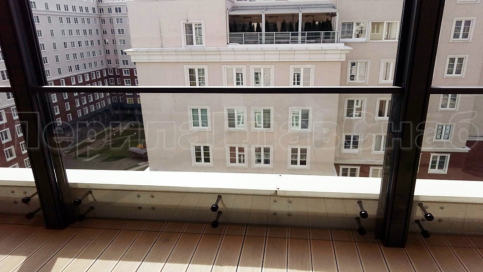 Такой заказ поступил к нам в компанию на ограждения балкона высотой 1200мм из прозрачного каленого стекла 12мм и с поручнем 60х40мм из полированной нержавеющей стали AISI304. Стекло крепится с торца к парапету с внутренней стороны при помощи точечного держателя. Поручень крепится к алюминиевым колоннам через фланцы. Поручень, фланцы и точечные держатели окрашены порошком по цвету антроцит.