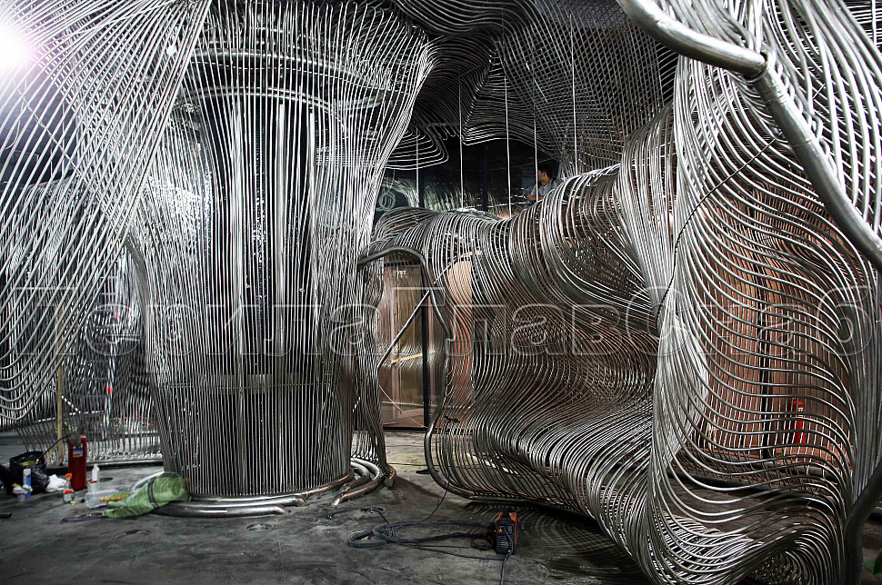 Шесть месяцев, более 150 человек, в 3 смены трудились над этим проектом. При кажущейся простоте, это очень сложная конструкция, тысяча квадратных метров 3-х мерной поверхности из нержавеющих труб 16 мм и 120 тонн льда. Каждая трубка по изгибу не похожа на предыдущие.Было много опасений за структуру льда, но удалось сделать его таким, как в Арктике.