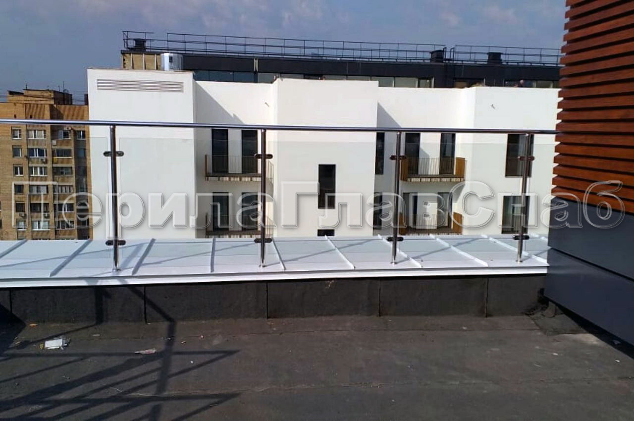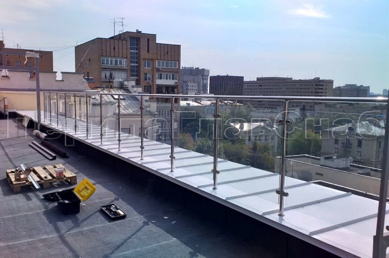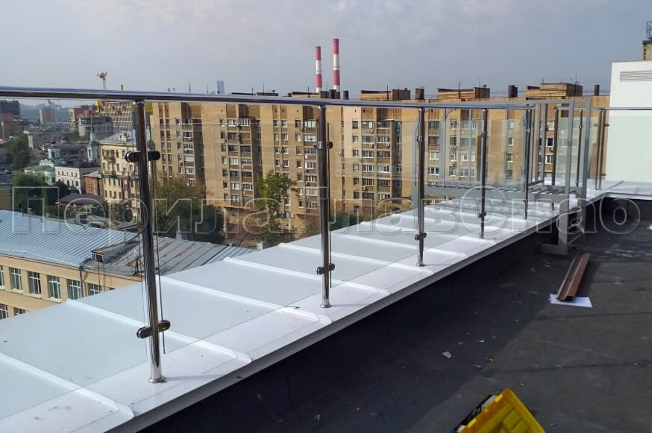 На Земледельческом переулке в Москве компания ПерилаГлавСнаб установила ограждение для эксплуатируемой кровли. Клиент был ограничен в бюджете, при объеме работ в тридцать погонных метров, но очень хотелось легкости и прозрачности. В связи с этим было предложено следующее конструктивное решение. Стойки, поручень и фурнитура собственного производства были выполнены из нержавеющей стали с повышенной коррозийной устойчивостью для уличных видов работ. А заполнение между стойками выполнено из закаленного стекла толщиной 8 мм с нанесением защитной пленки в заводских условиях. Своего рода бюджетная альтернатива стеклу триплекс. Для жесткости перил на поворотах устанавливается по две стойки, а не по одной. Это чуть дороже по материалам и по работе, но такое минимальное увеличение бюджета, скорее инвестиция в функционал и безопасность. Ограждение монтируется в бетонное основание парапета через металлическую крышку. Отверстия в крышке обработаны силиконом для герметичности. Глубина бурения 200 мм , труба вклеивается на специальную смесь. Все эти меры в купе позволяют дать заказчику хорошую гарантию. Ветрозащитное ограждение изготовлено, установлено и сдано заказчику за две недели в срок, как и было оговорено в договоре.