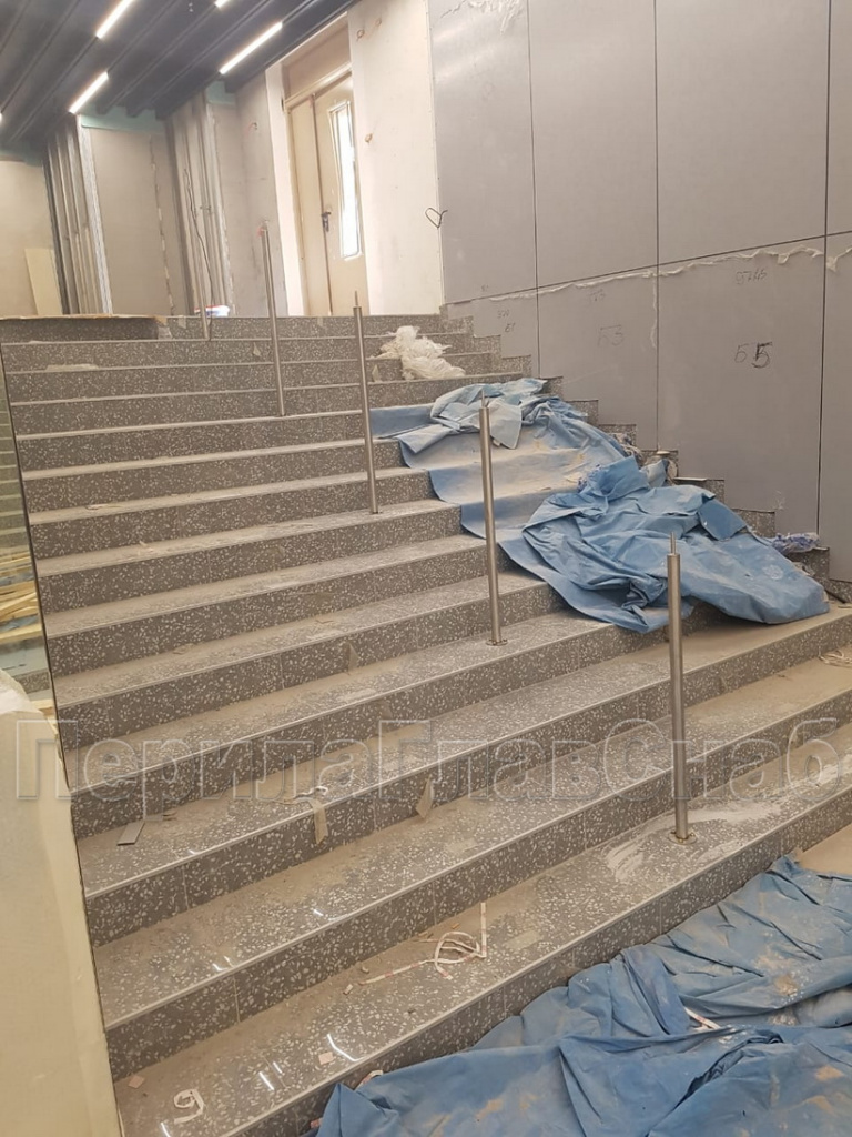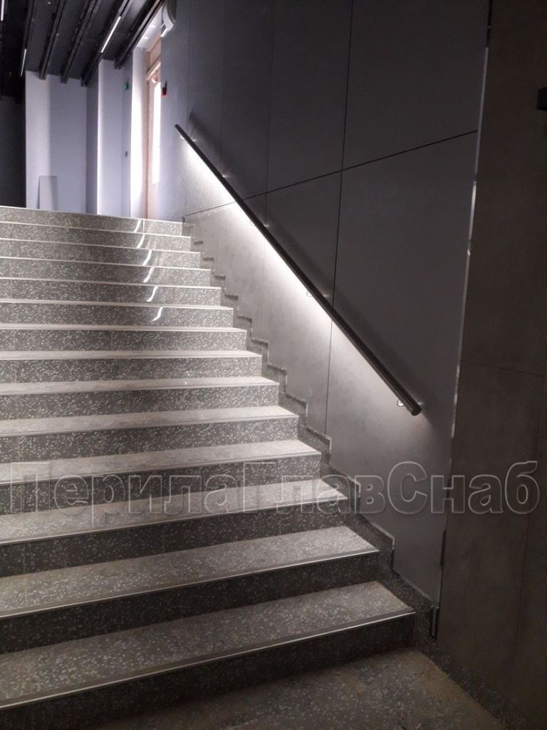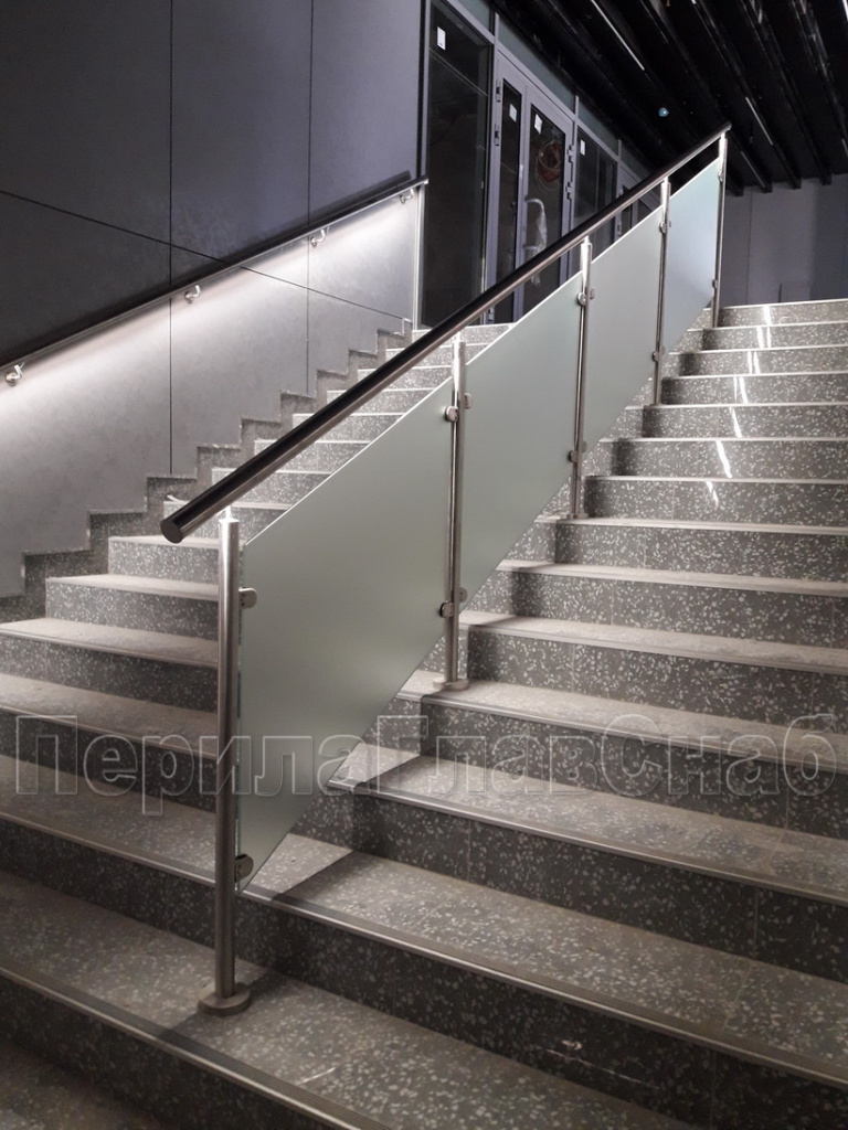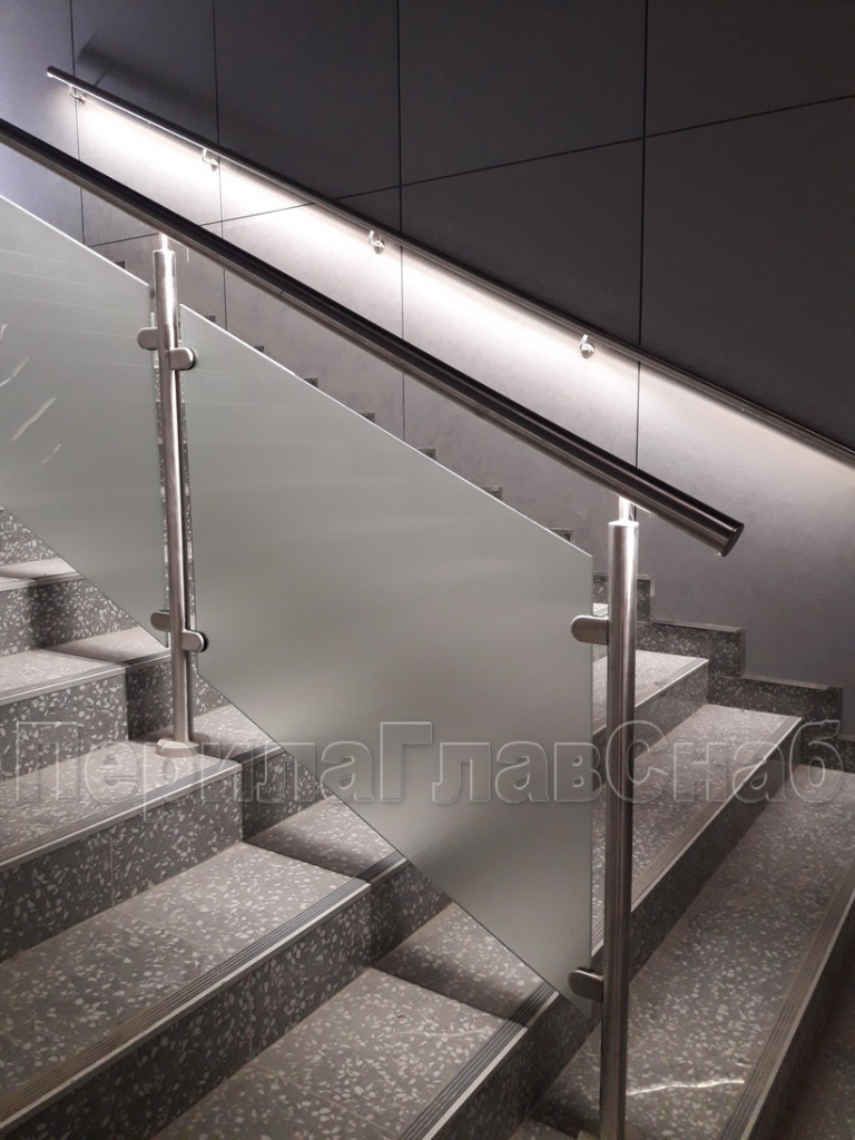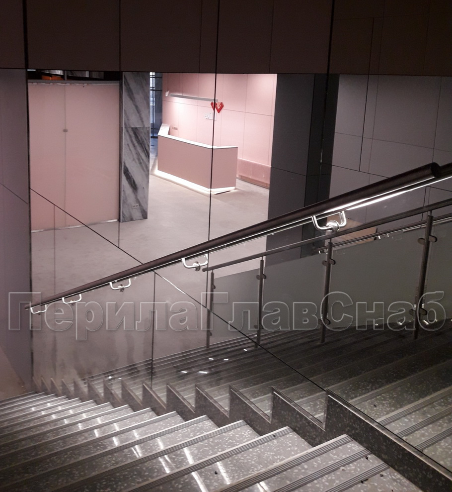 Конструктив: перила с  подсветкой  и  стеклянным заполнением,  пристенные поручни  с подсветкой, сталь шлифованная.