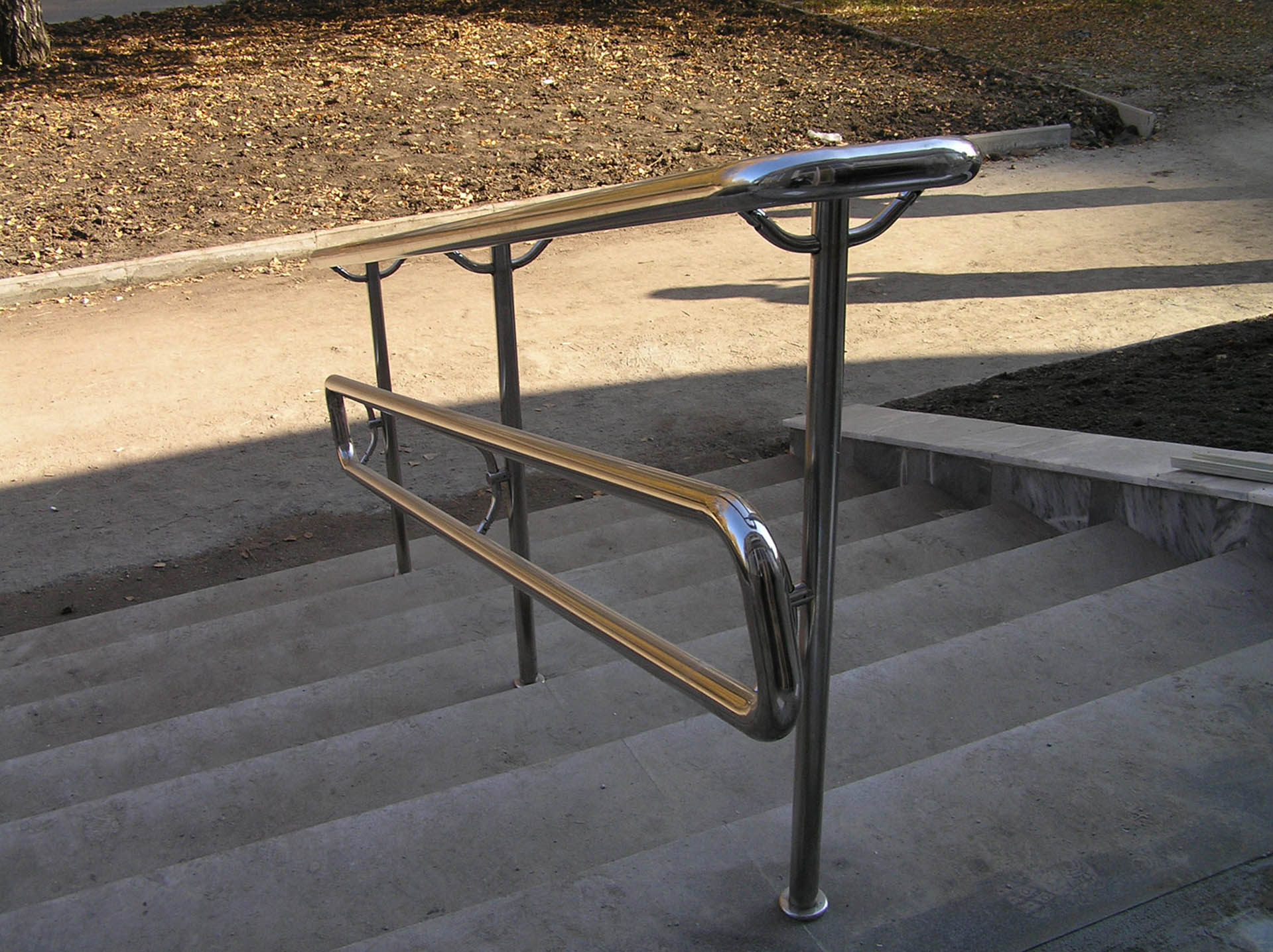Перила пандуса из нержавейки. Ригельное заполнение и двойной поручень на выносе