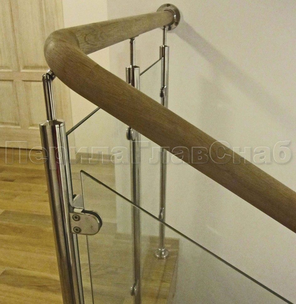 Ограждение с круглым деревянным поручнем с зажимными стеклодержателями и стойками с деревянными вставками