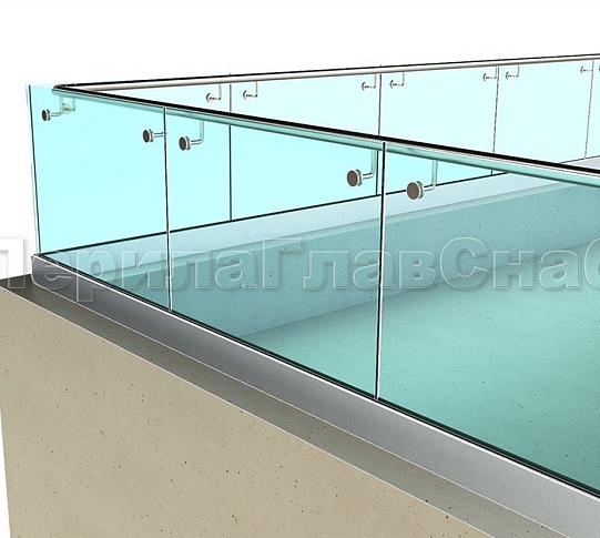 Конструкция такого ограждения не содержит стоек. Несущими характеристиками обладает стекло и алюминиевый профиль, в который стекло крепится. Используется алюминиевый анодированный «зеркальный» профиль.