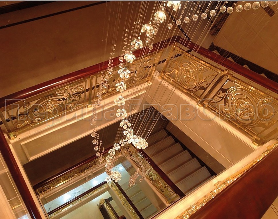 Ограждение лестницы с прозрачным стеклом, стойками и поручнем из латуни