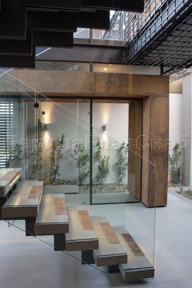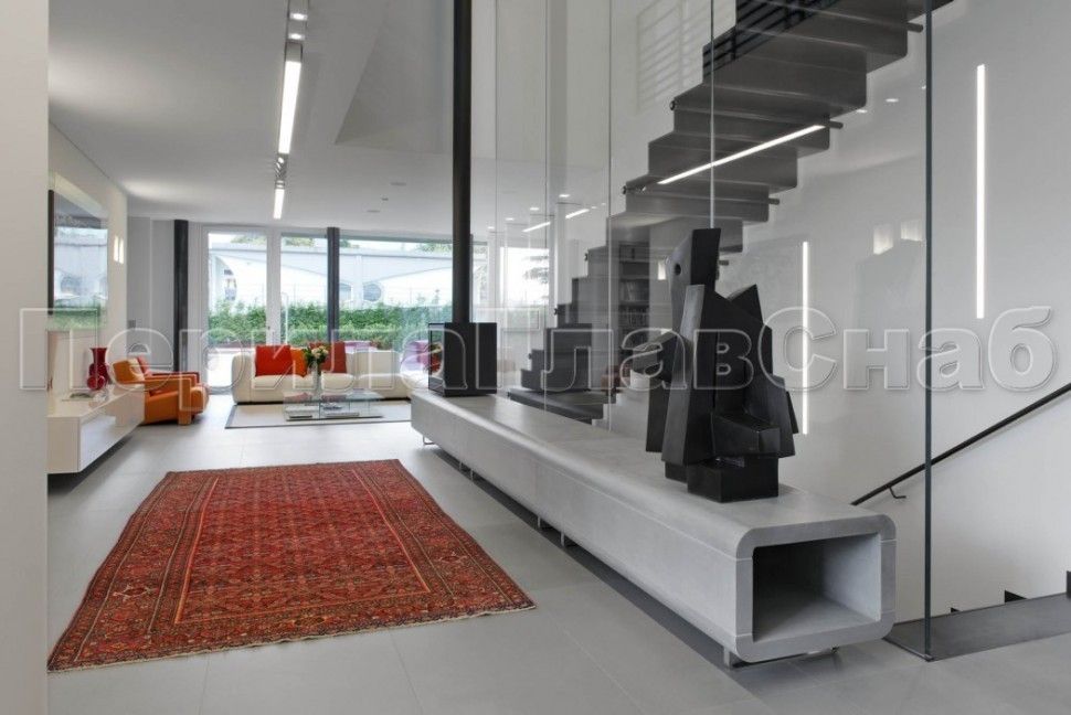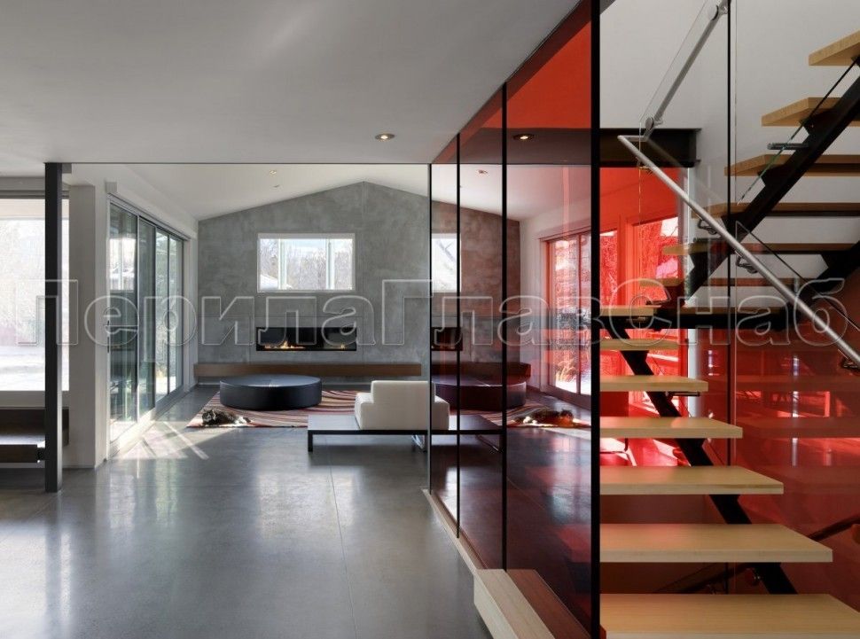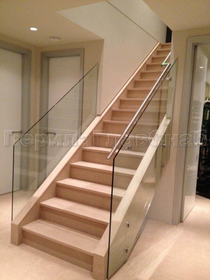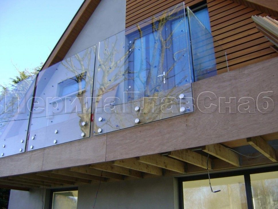 Красивая опция - частичная матировка нижней части несущего стекла (делают обычно там, где стекло примыкает к лестничному маршу или перекрытию).