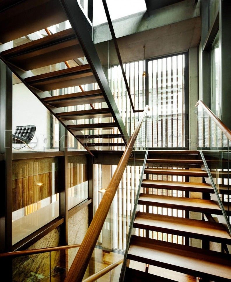 Ограждение лестницы с квадратными стойками и пластинчатыми стеклодержателями