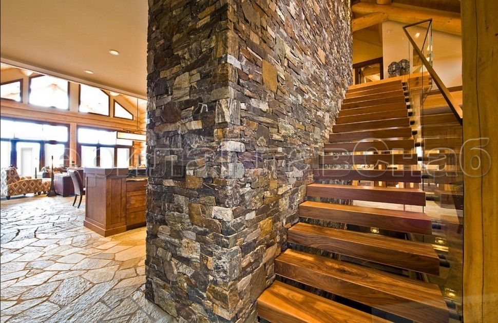 Ограждение с деревянным поручнем на точечном креплении на лестнице