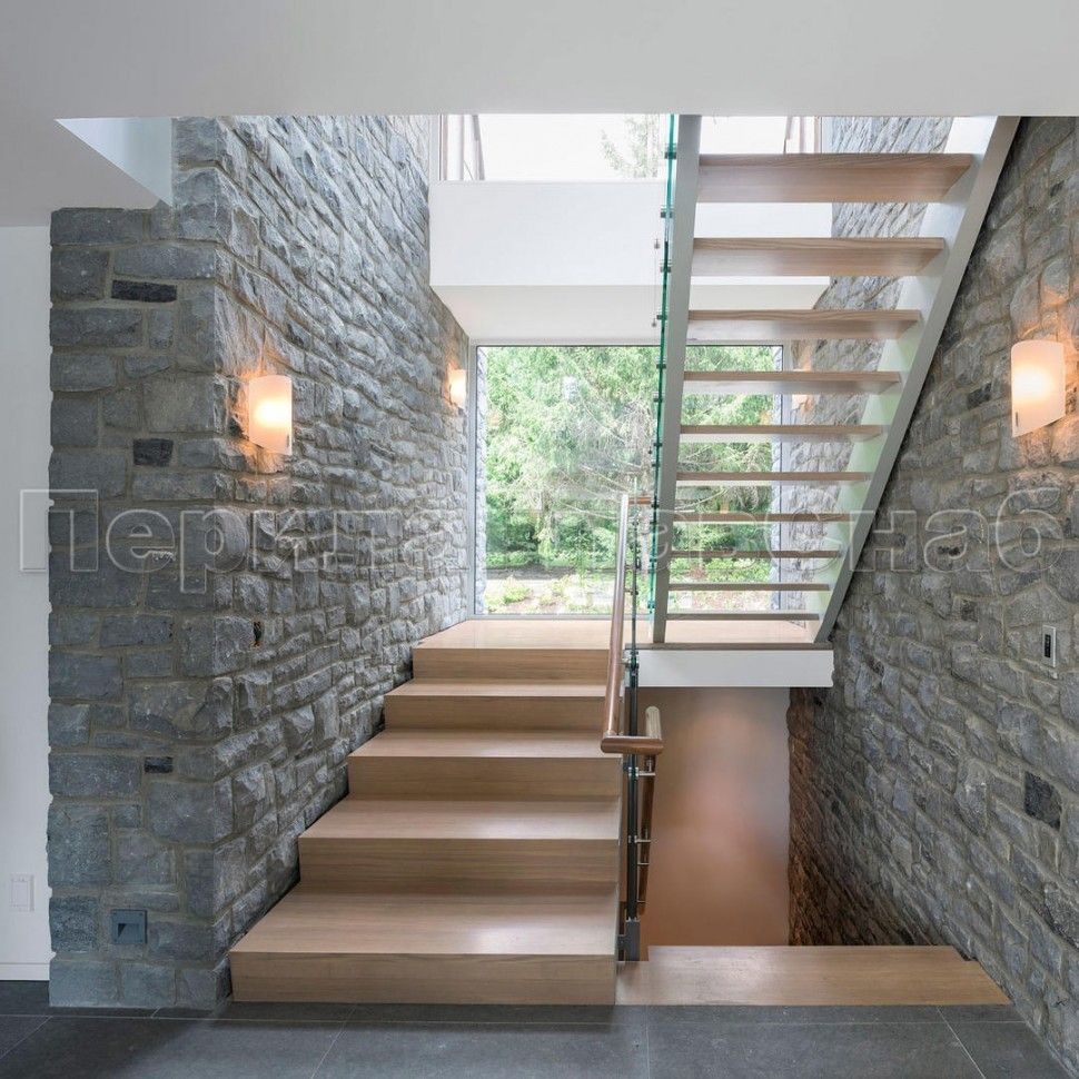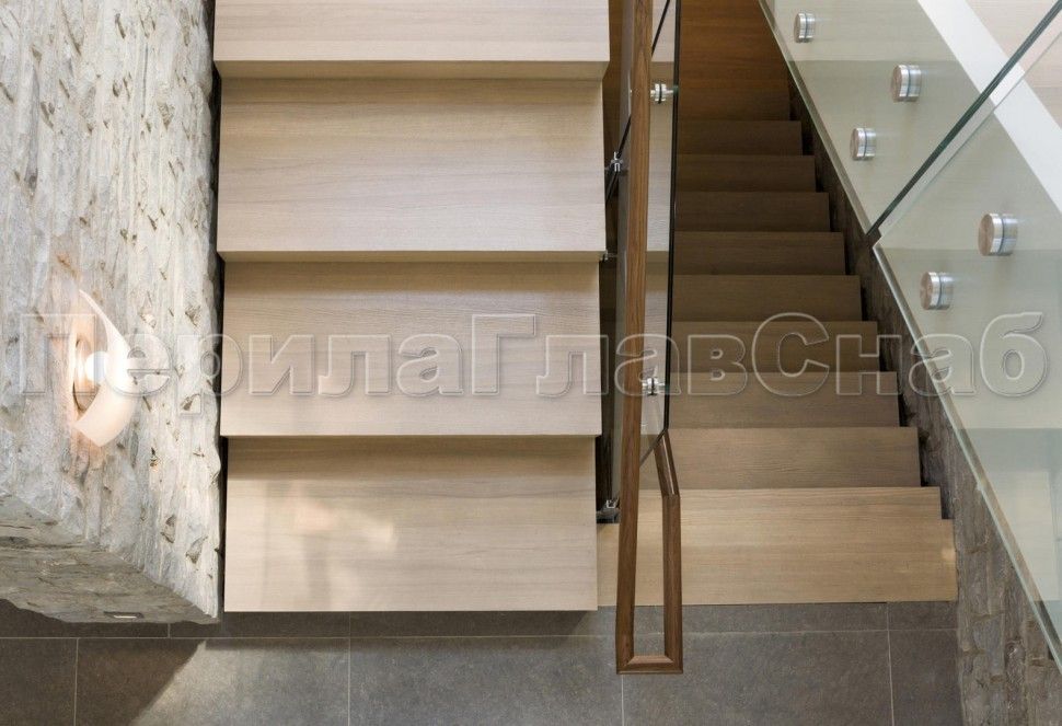 Ограждение с деревянным поручнем на выносе на точечном креплении на лестнице