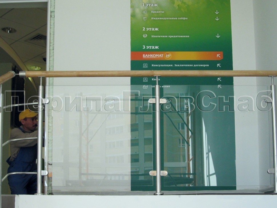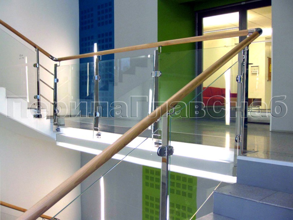 Ограждение с деревянным поручнем с зажимными стеклодержателями и стойками