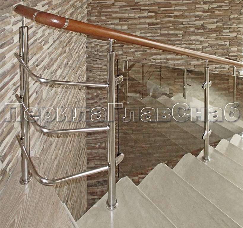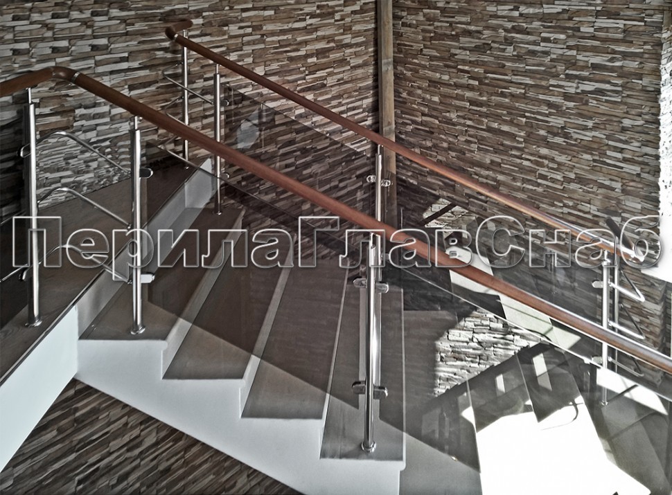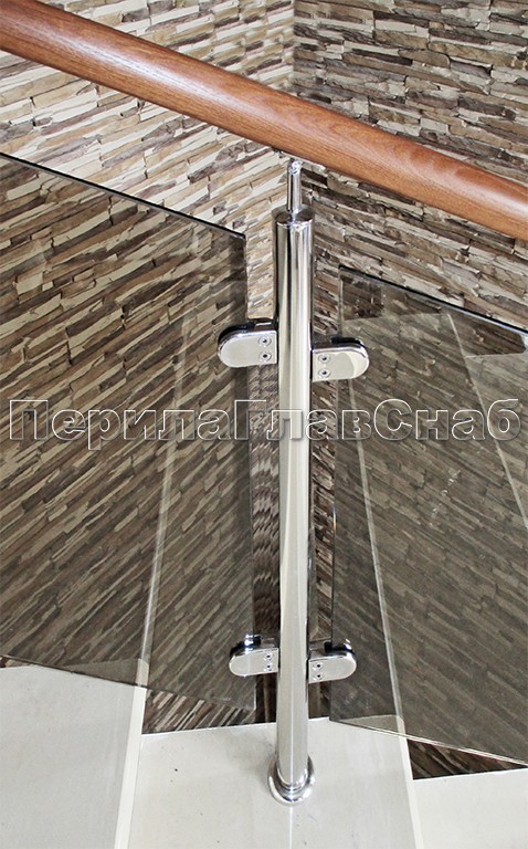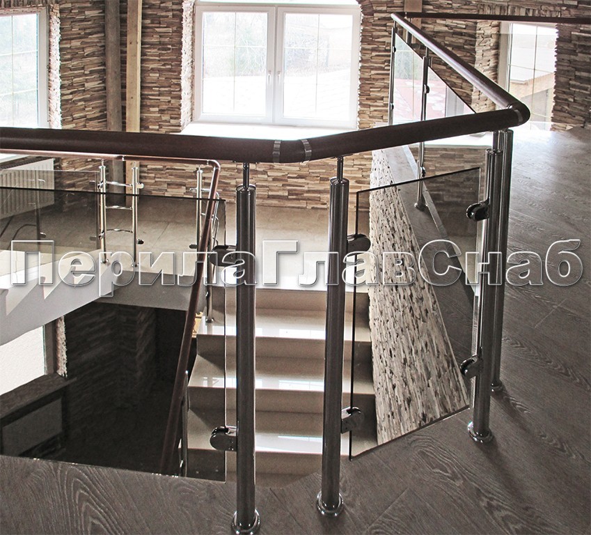 Ограждение с круглым деревянным поручнем с зажимными стеклодержателями и стойками с деревянными вставками