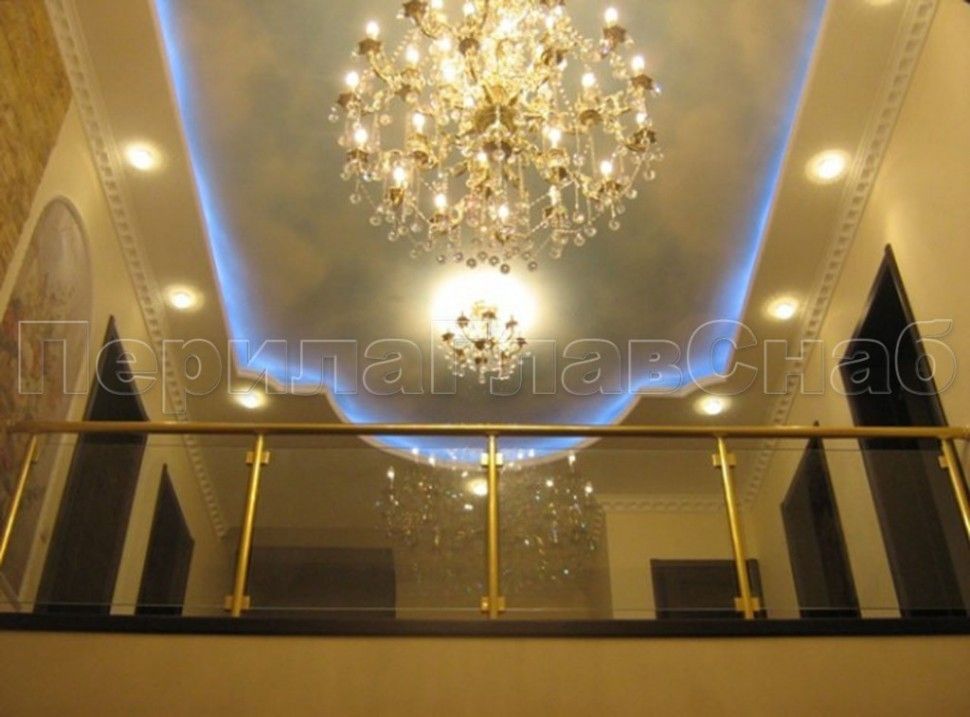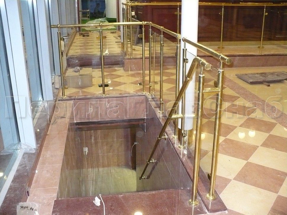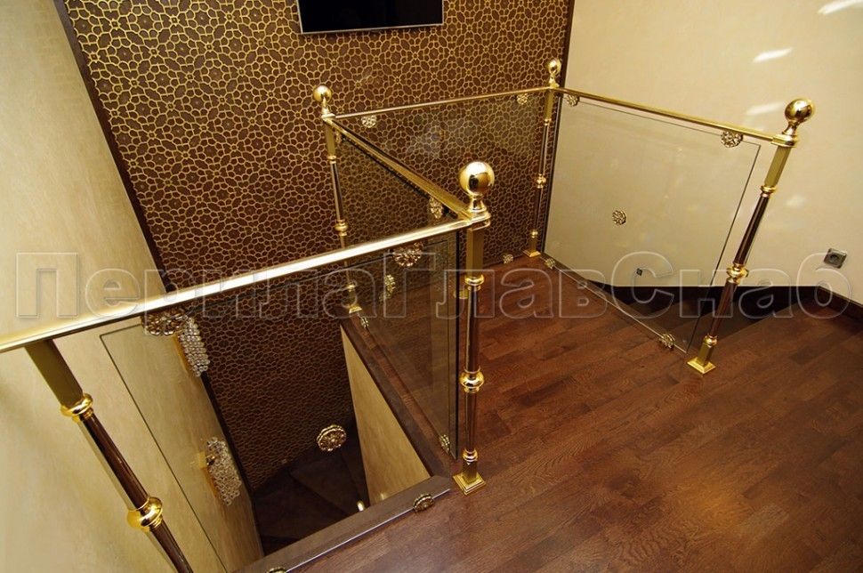 Ограждение лестницы с прозрачным стеклом, стойками и поручнем из латуни