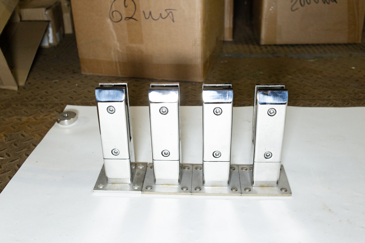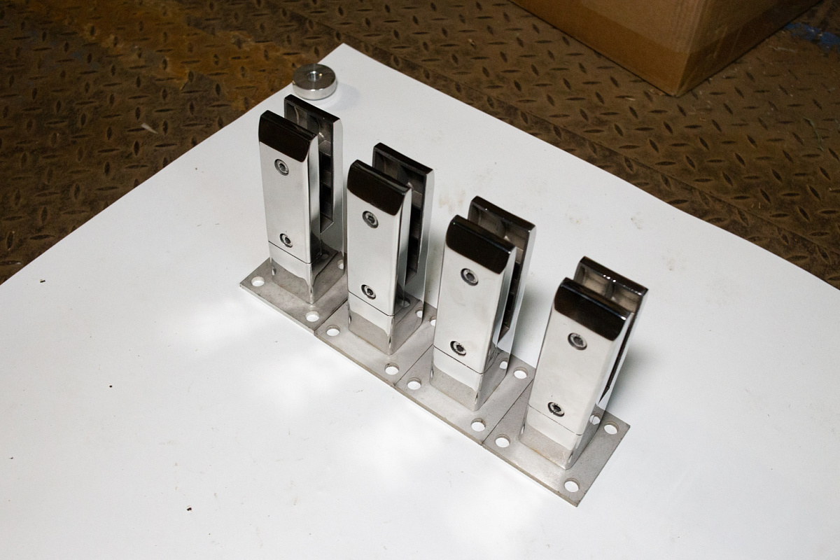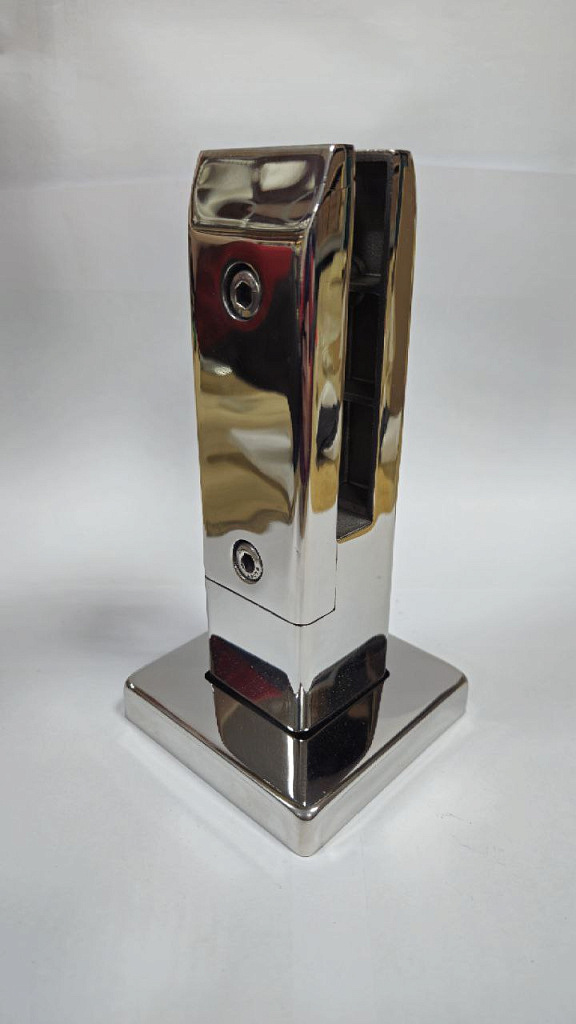 Стеклодержатель литой напольный, плоский 50х50х190 мм, для стекла 10-12 мм, полированный AISI 304, уценненый.